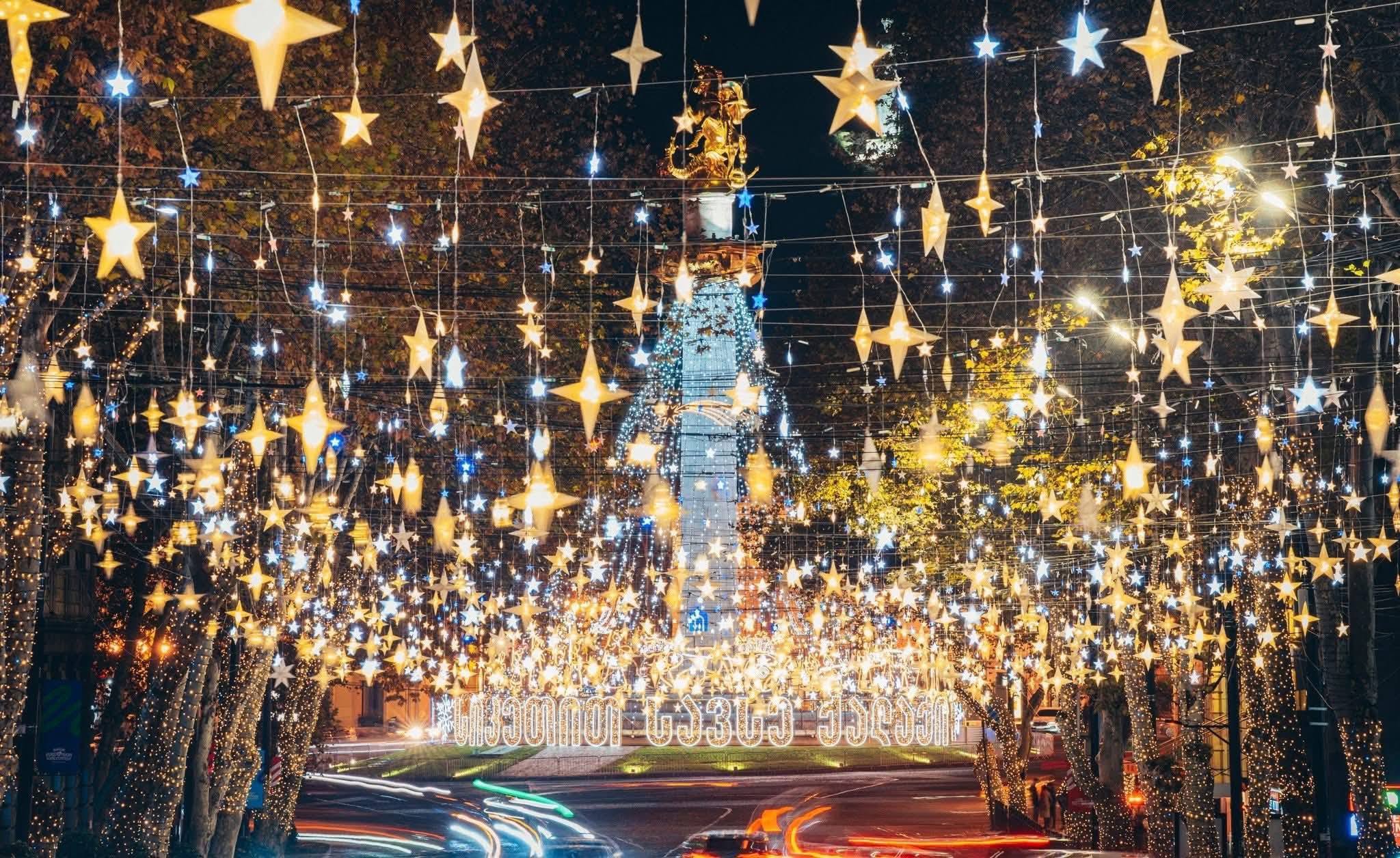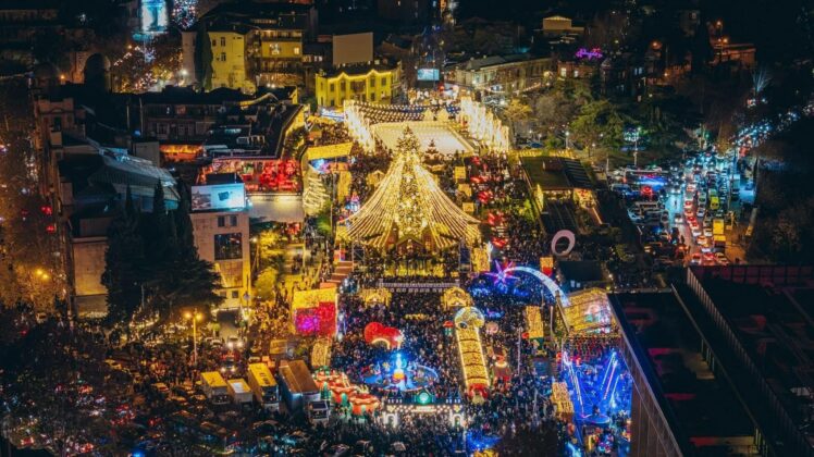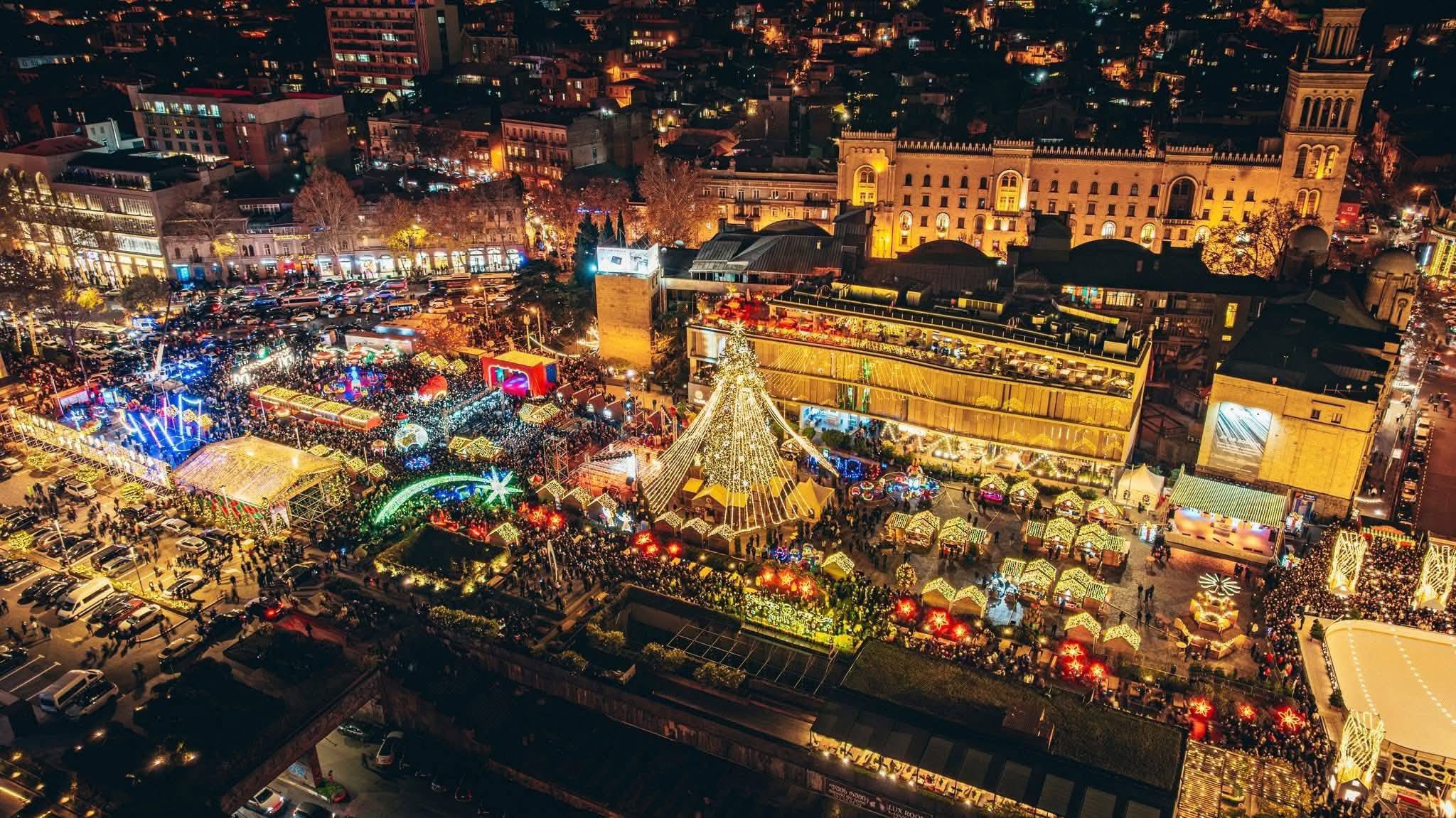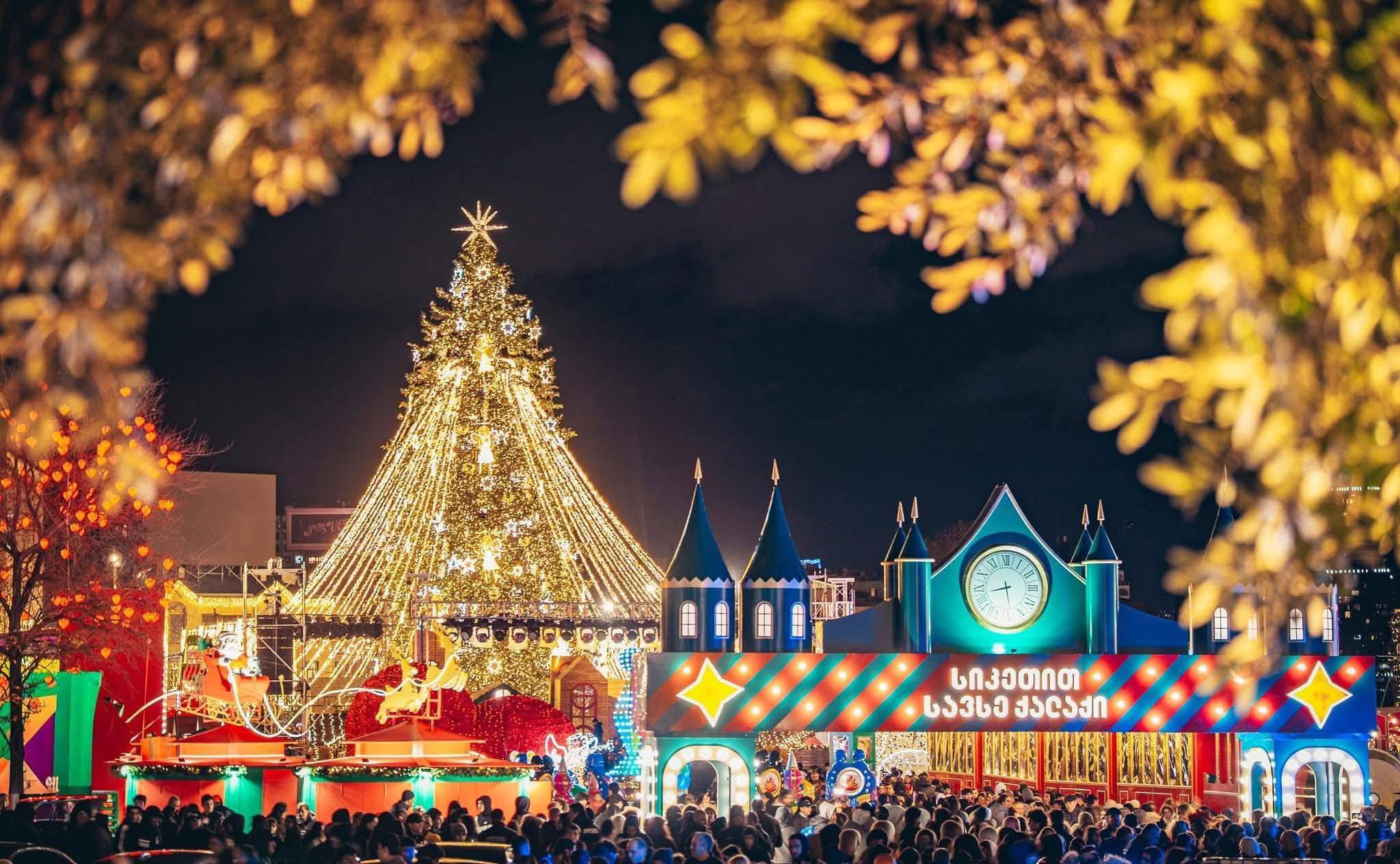 К концу декабря Тбилиси окончательно обретает свое традиционное праздничное лицо. Улицы и площади уже залиты огнями, витрины украшены, а главное внимание притягивает площадь Первой Республики — именно здесь в этом году разместилась главная новогодняя локация столицы.
